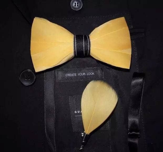 Handmade Yellow Feather Bow Tie W/free Lapel Pin Set