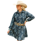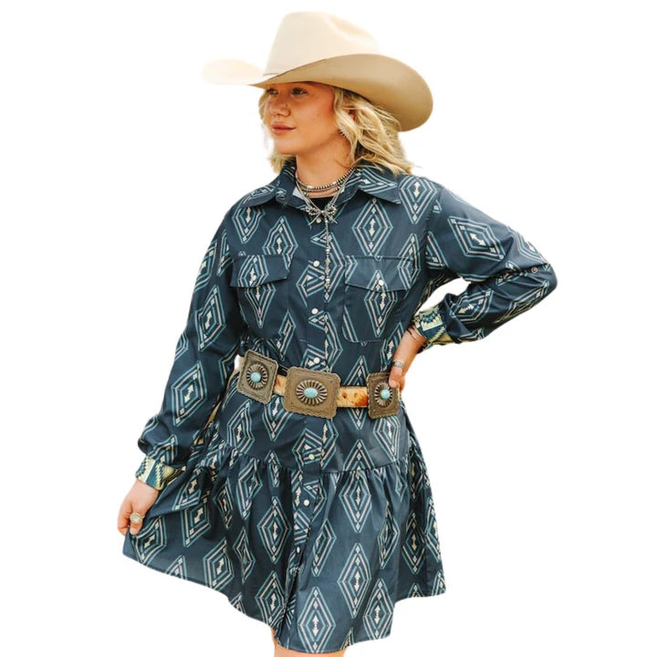This adorable blue on blue Aztec print is designed to flatter! With a gracious shirt style, contrasting cuffs, dropped just above the knee offers a stylish and flirty drop waisted skirt this dress offers a year-round piece. Pair with our Lane or Corral boots and a classic hat!