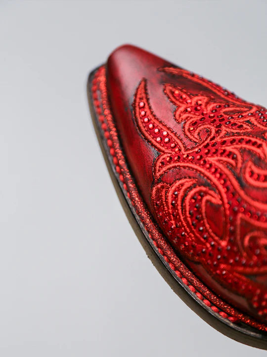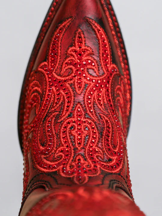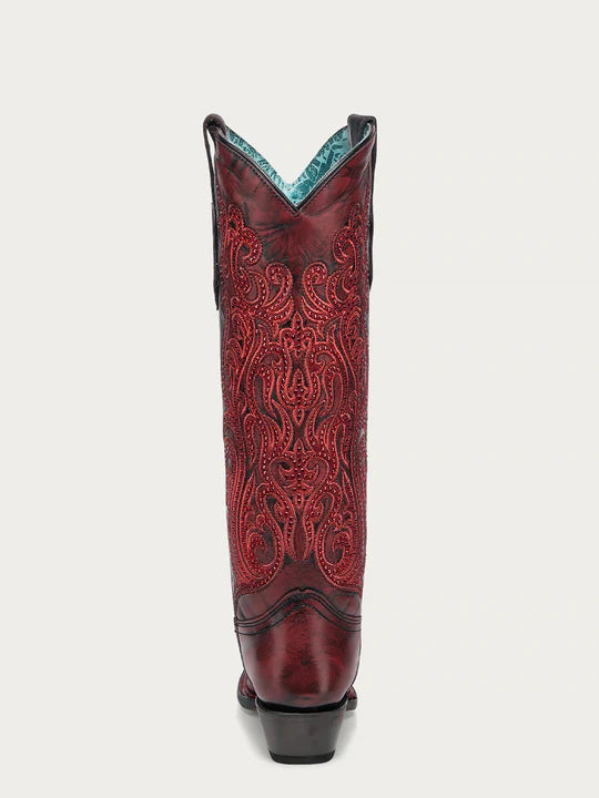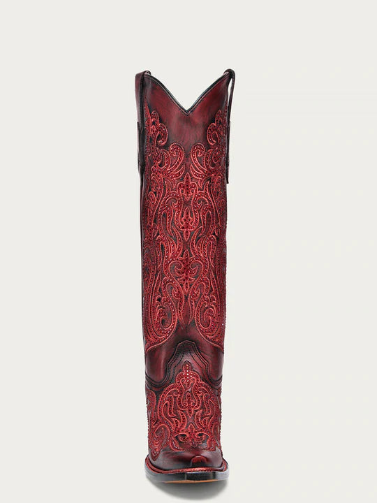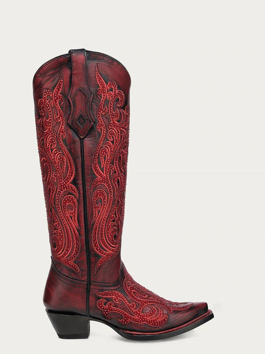 Corral Boots - Women's Embroidery & Crystals Red/Black Tall Top Snip Toe Boot #A4869