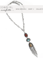 Silver triple stone drop necklace featuring red agate, turquoise, and jasper with silver fringe chain