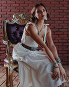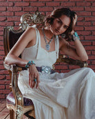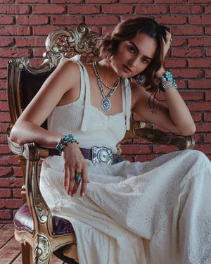 This beautiful piece lays perfectly as a statement length and presentation.  Mixing ivory, turquoise, and concho features offer that 'have it all' look.