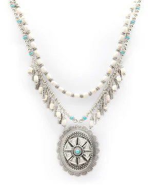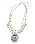 • Bold concho pendant with double layered multi dangle necklace with ivory and turquoise accents