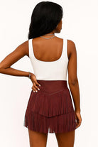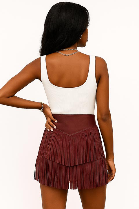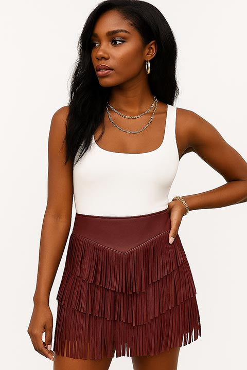 This eye-catching skirt features cascading layers of fringe that move effortlessly with every step. designed with a sleek fitted waistband and.