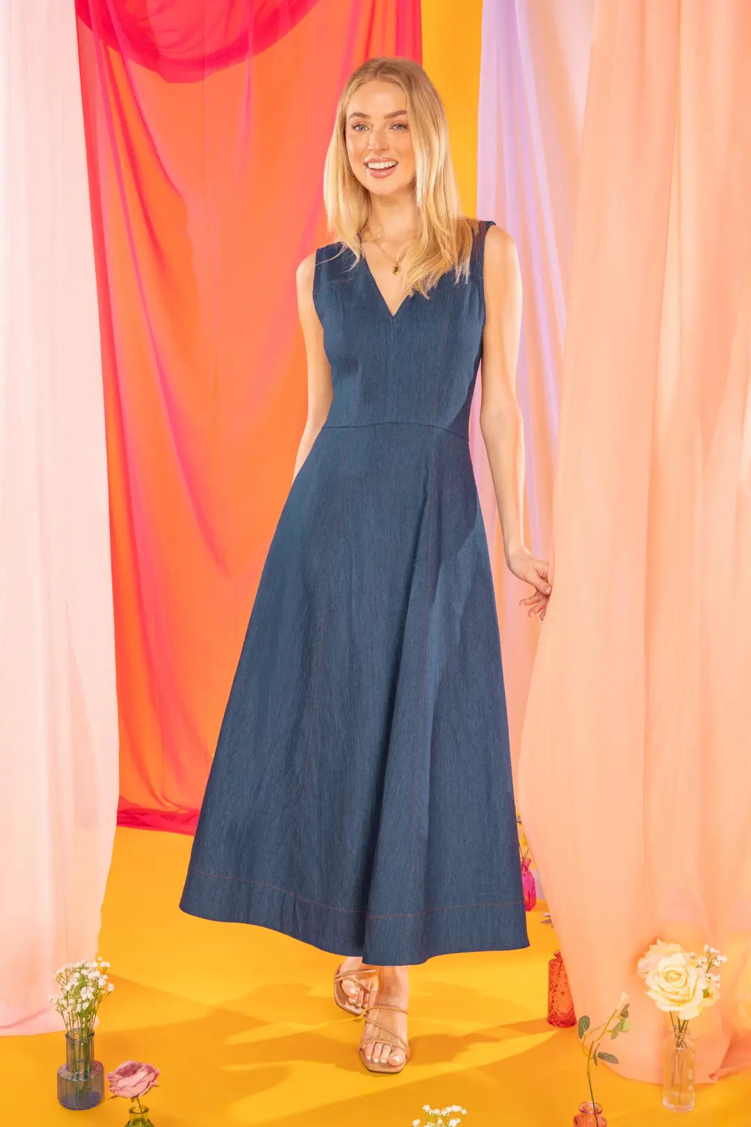 SLEEVELESS WASHED STRETCH DENIM V NECK MIDI DRESS WITH POCKETS