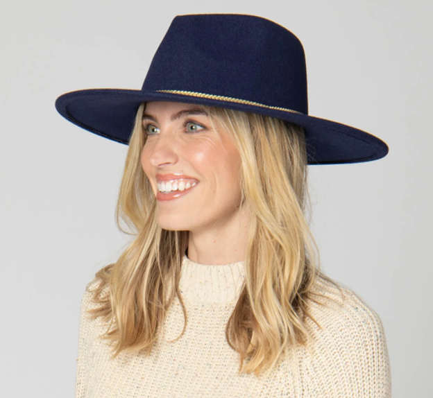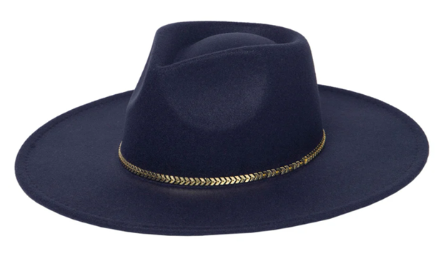 Make a statement with our Women's Fedora in Navy. Crafted with luxurious 100% polyester faux felt, this fedora features a stylish 3.75" brim and an elegant Chevron Gold Chain Trim. With an adjustable fit and a nod to high fashion, this fedora is a must-have for any sophisticated wardrobe.