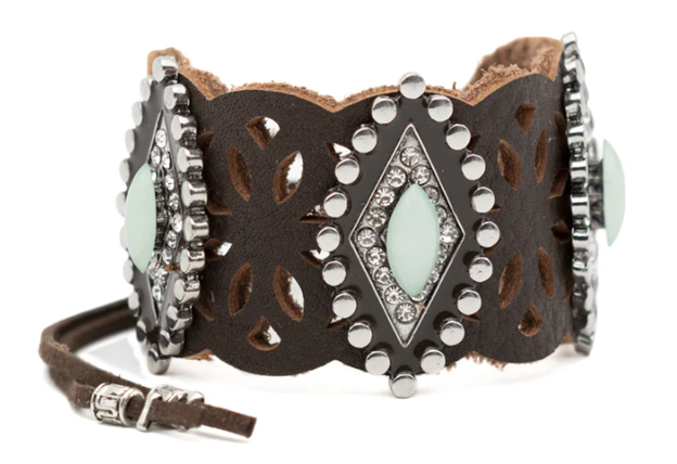 - Hand-painted dark brown perforated leather cuff