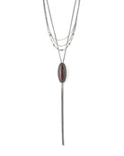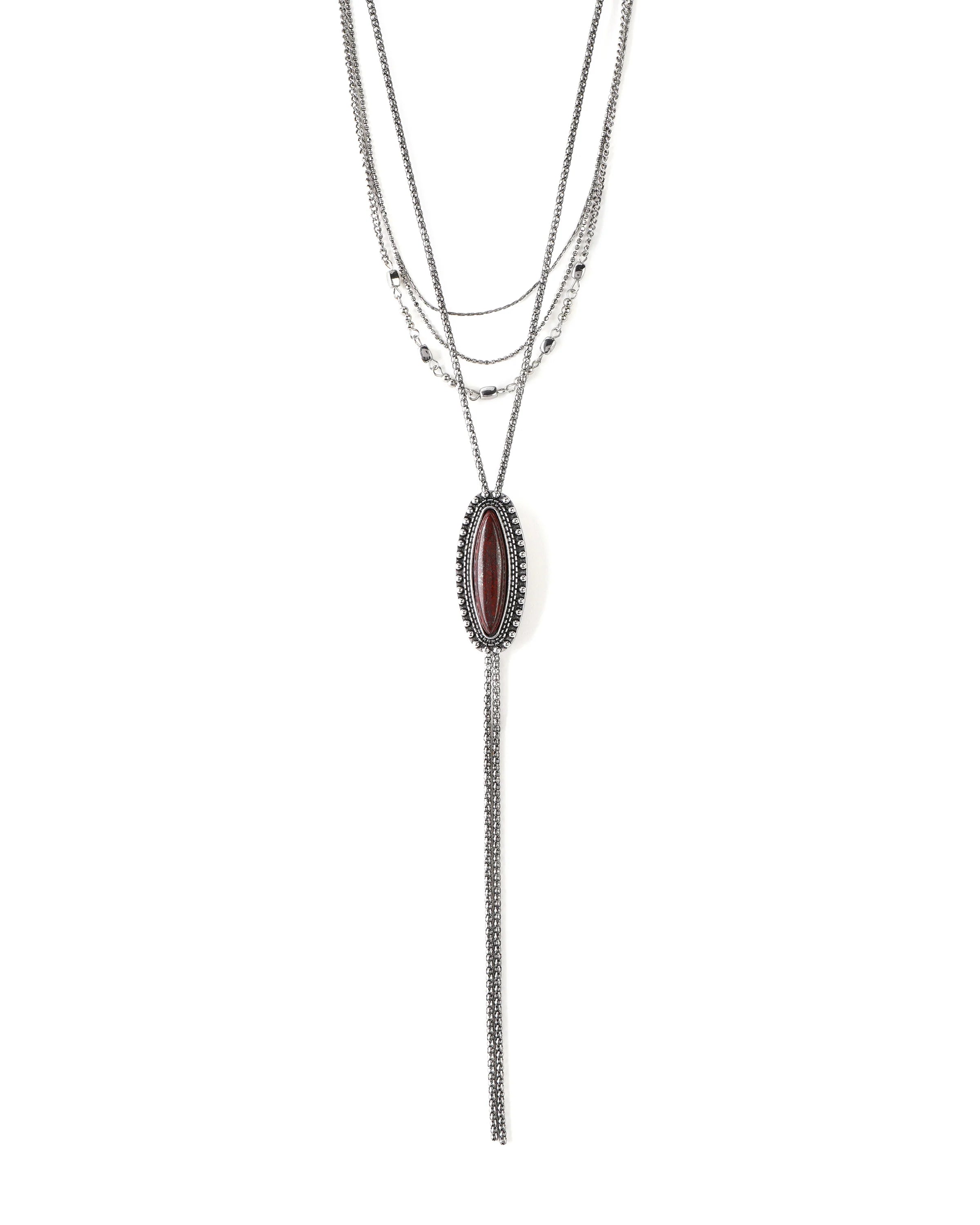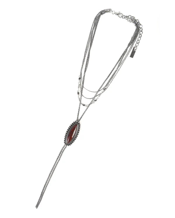 Multilayered silver necklace featuring an inlaid red agate stone