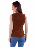 Suede concho vest is crafted from soft suede and features antique silver concho-style buttons along the front closure for a rustic touch. tailored.