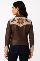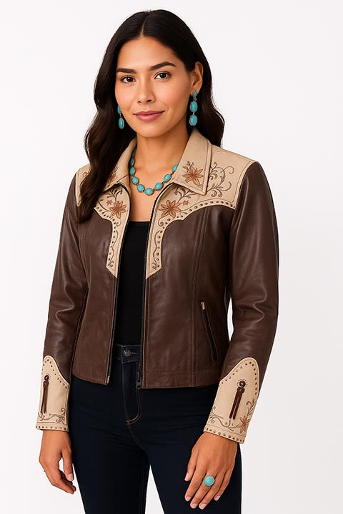 Crafted from rich brown leather with contrasting tan panels, this jacket high-lights intricate floral embroidery and decorative stitch details that.