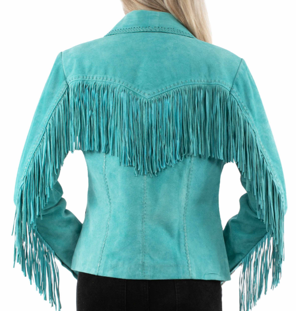 Suede fringe jacket. We love this jacket with or without a layer beneath! This vintage inspired suede fringe jacket will bring out the cowgirl in you!. It features a snap front closure, front and back yokes with a contrast pick stitch running along the perimeter of the yokes. Detailed lacing on seams, collar, lapels and down the front. The sleeves have fringe and a contrast pick stitch. Dry clean only. We recommend ordering one size up.