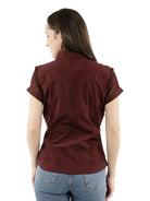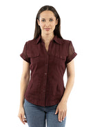 This blouse features cap sleeves with mesh shoulders and mesh back yoke.