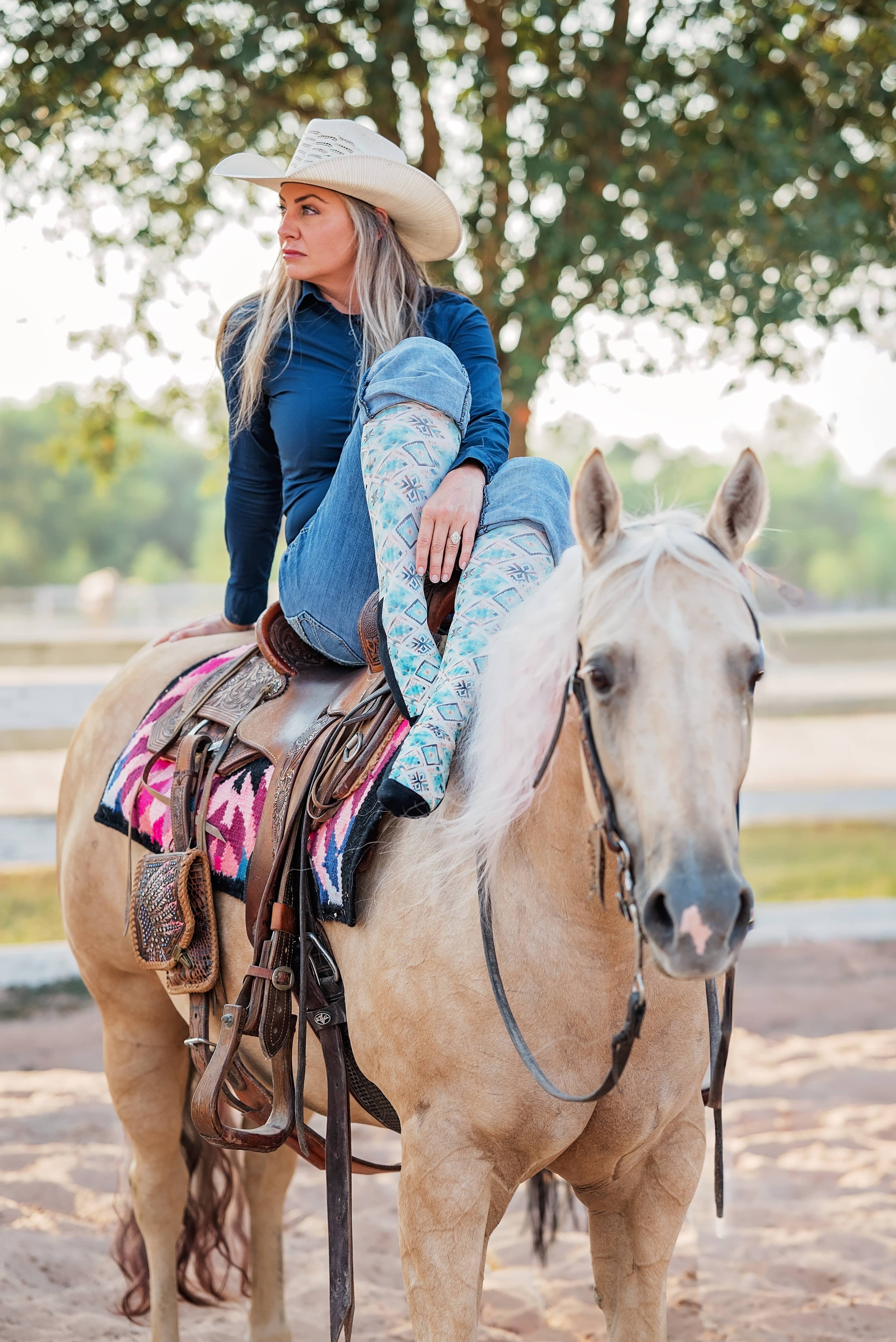Inspired by desert sunsets, Canyon Glow bring a touch of Southwestern style to your step. With turquoise, copper, and sandy tones arranged in a bold geometric pattern, these boot socks are the perfect blend of comfort and western flair.