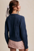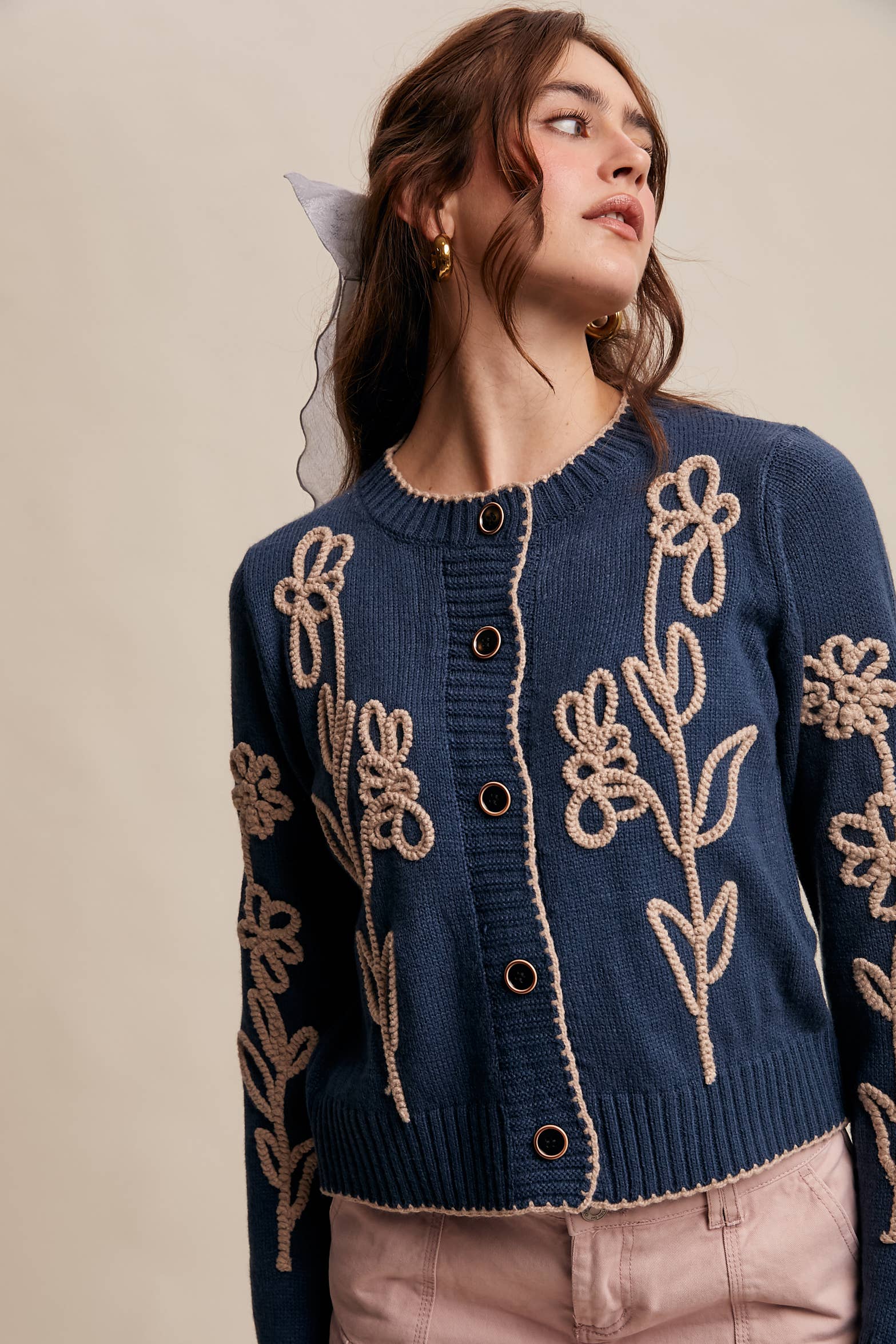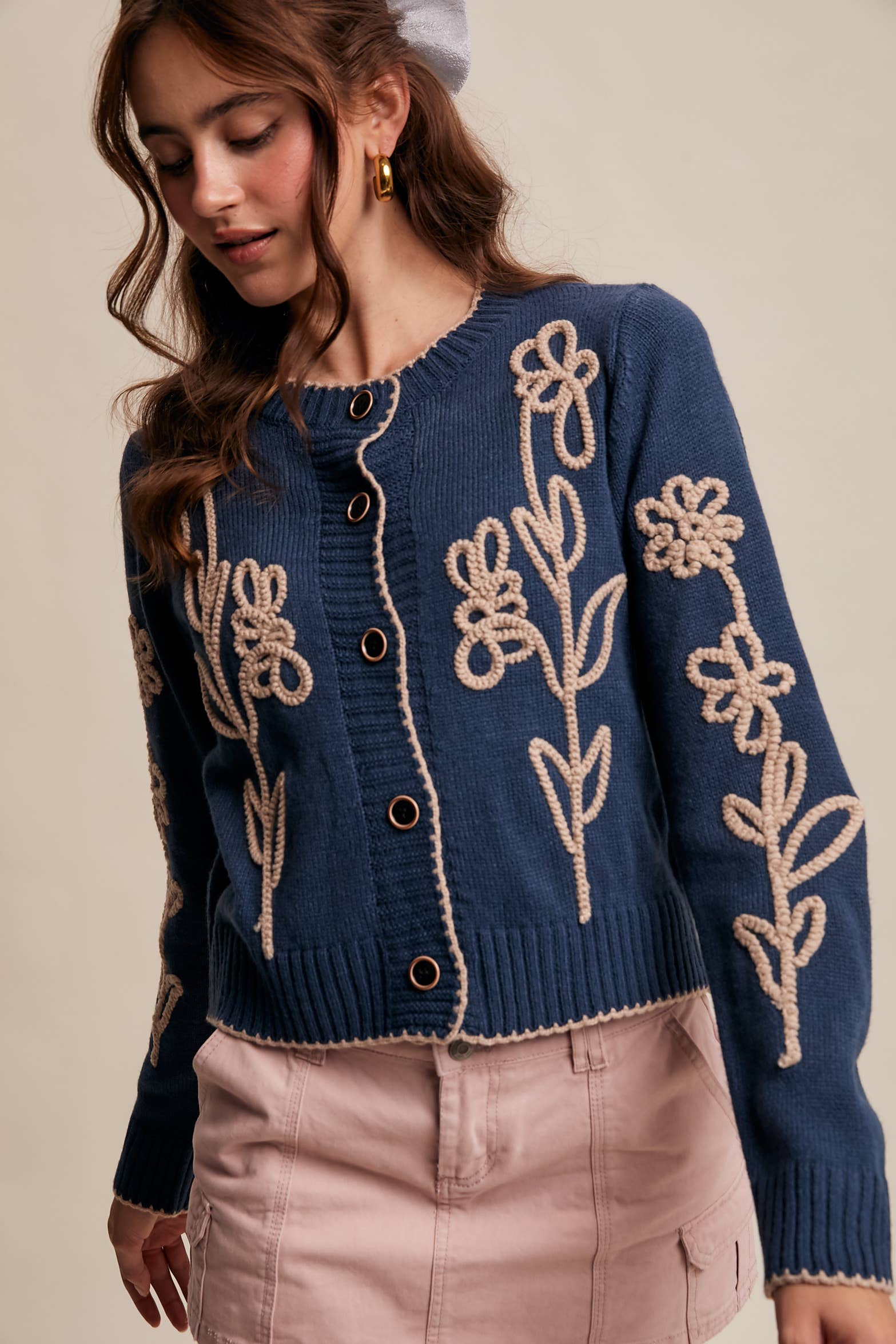 Embroidered Floral Knit Cardigan: Vintage Blue / L