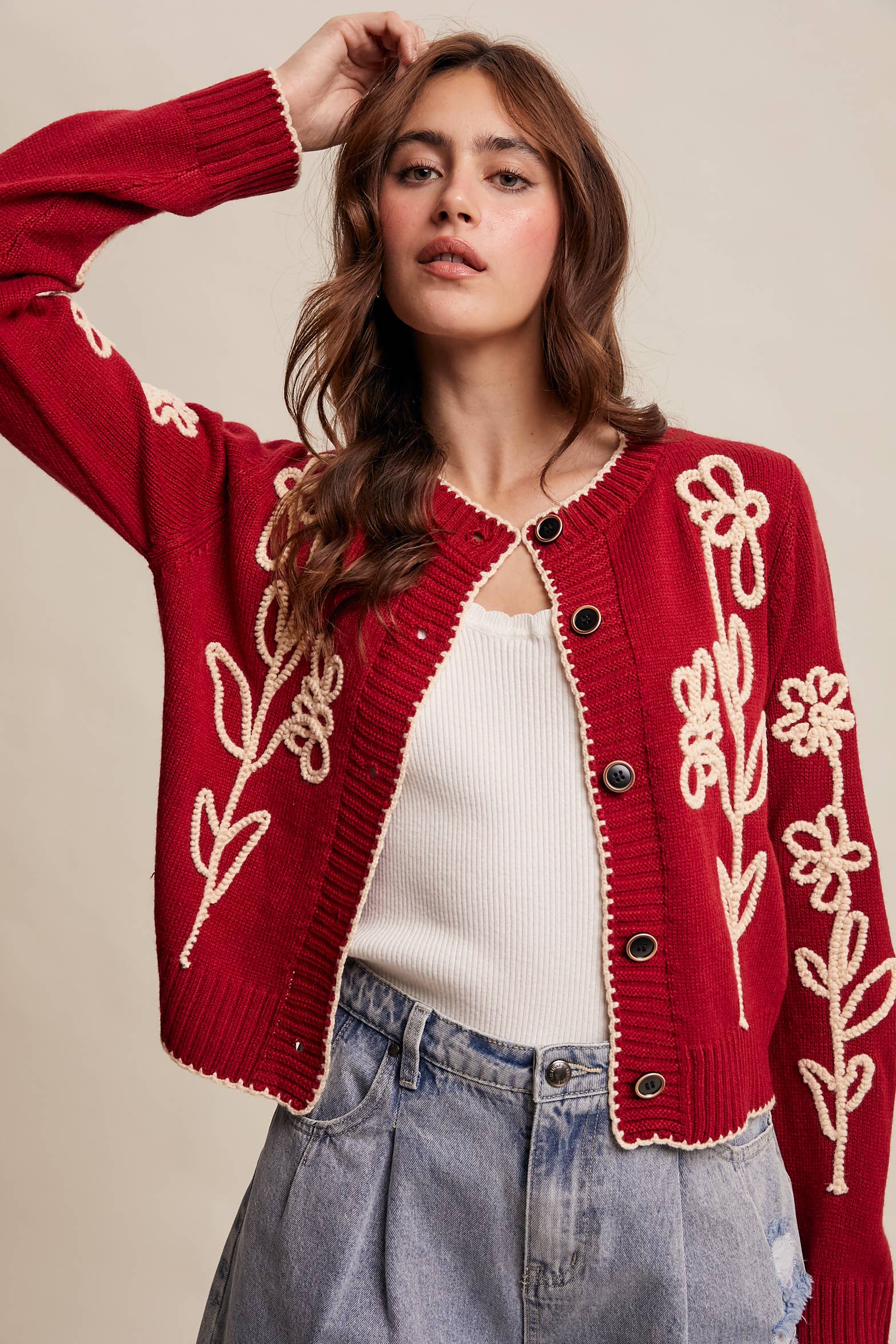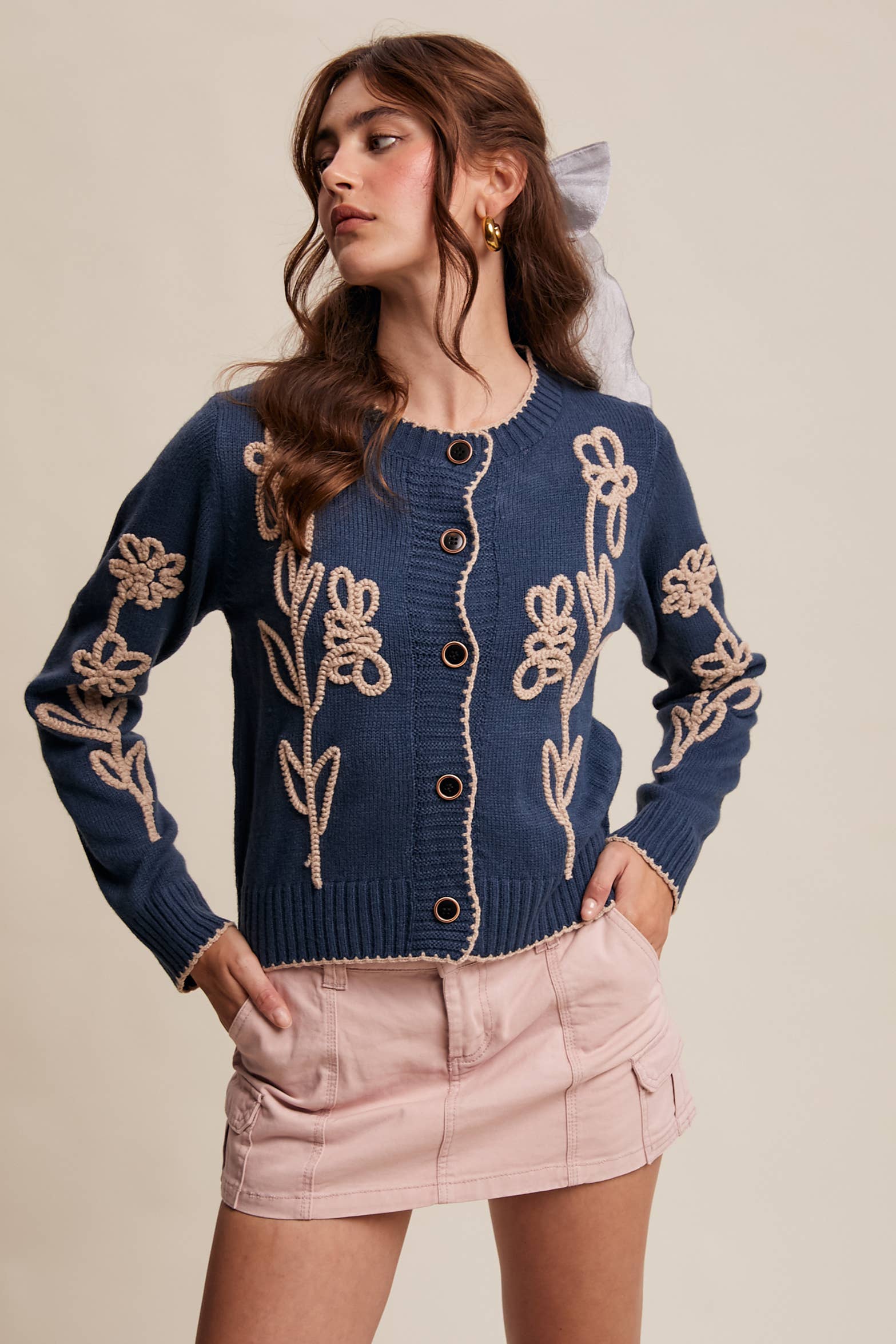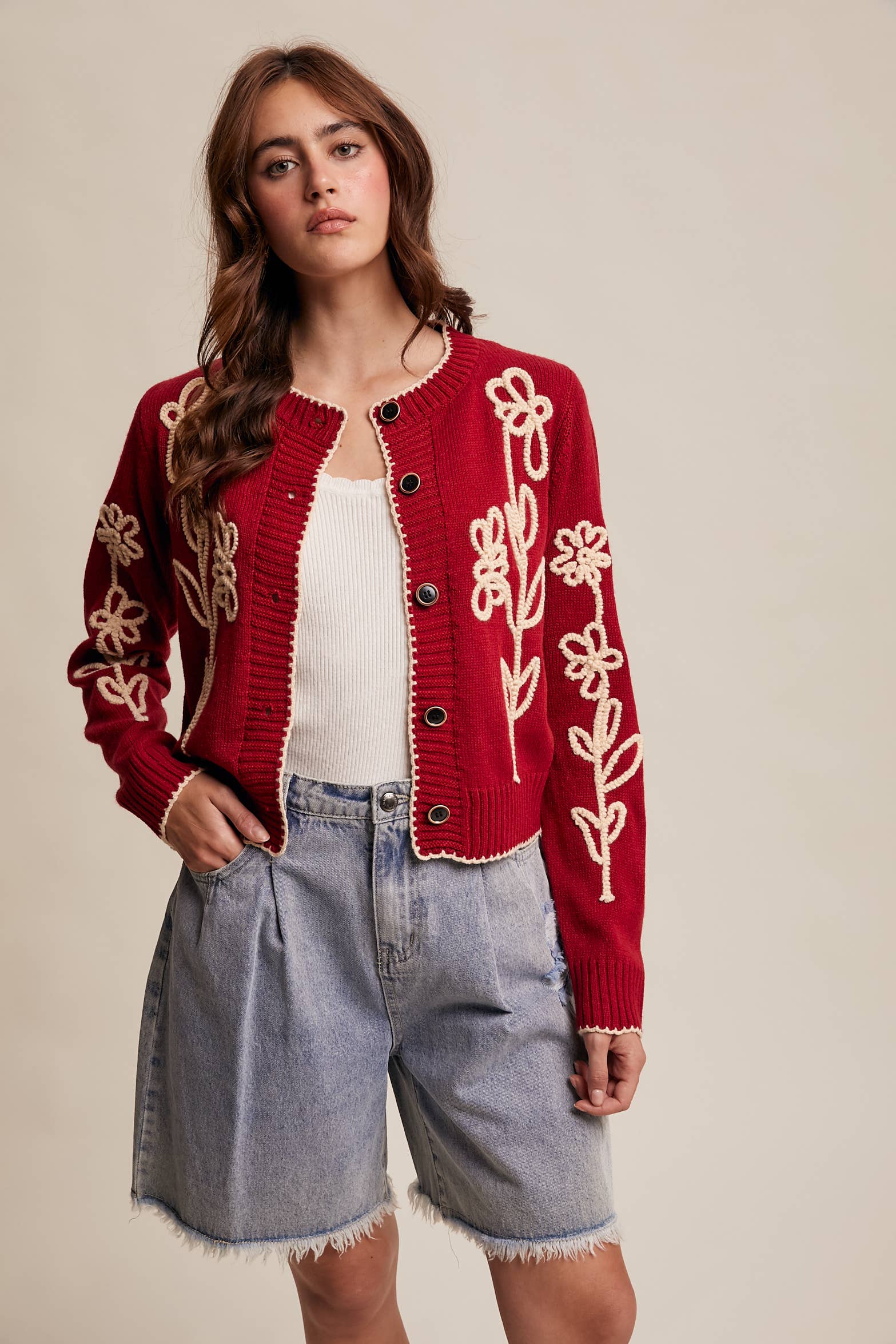 - Bold Embroidery Detail: Features oversized cream floral embroidery for a whimsical, standout look