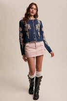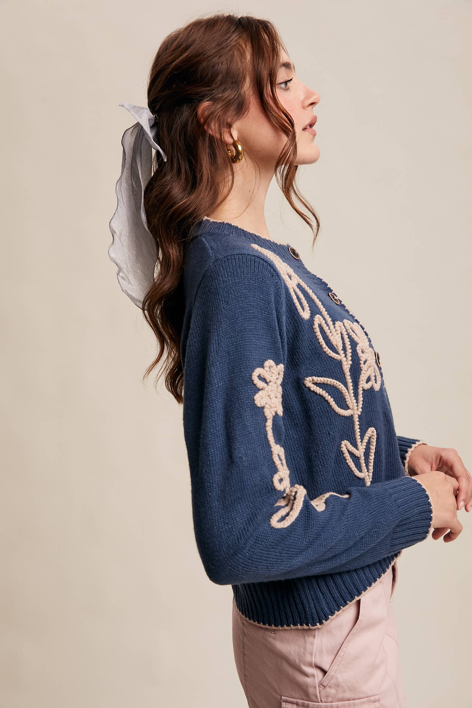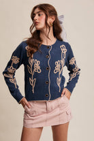Embroidered Floral Knit Cardigan: Vintage Blue / S