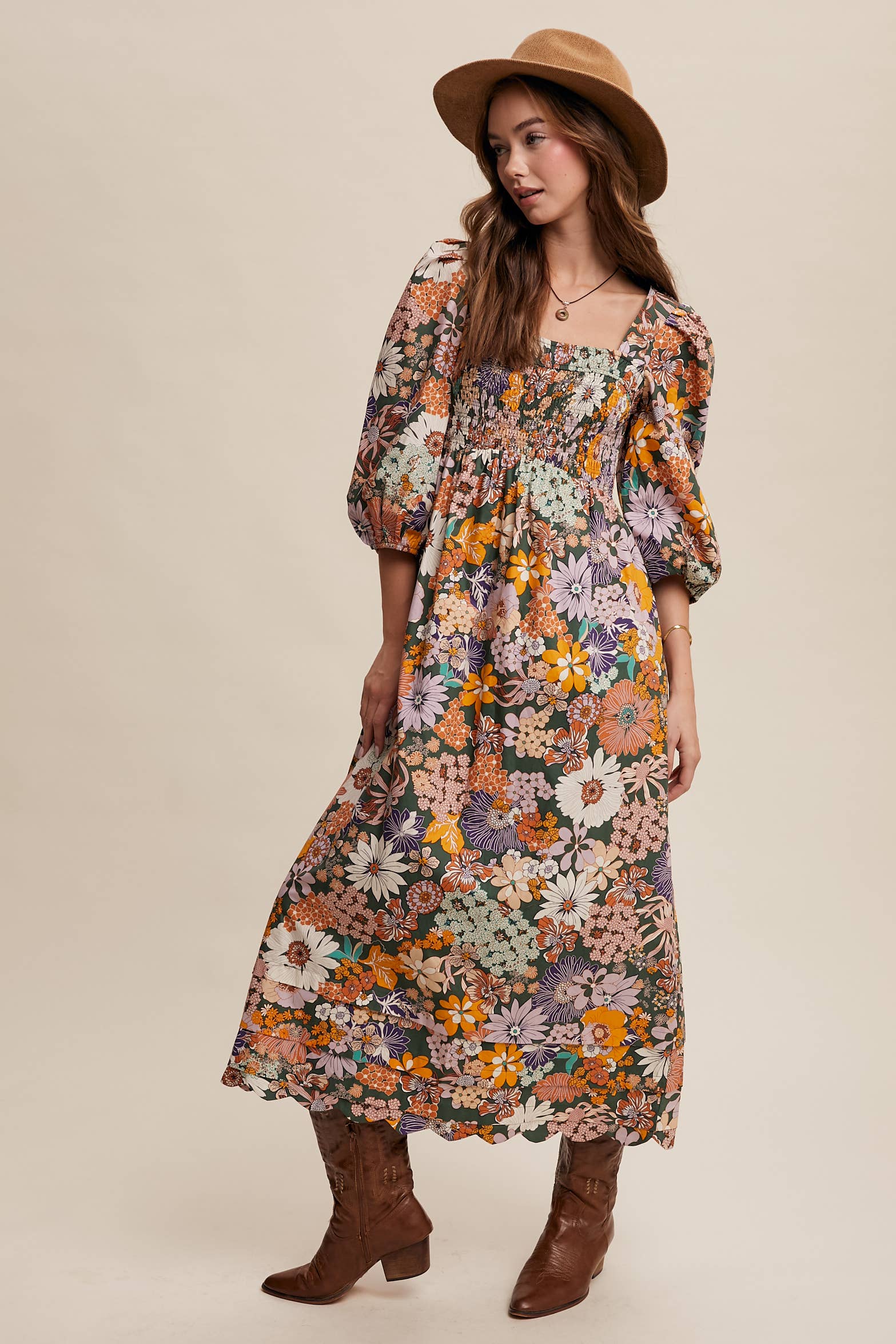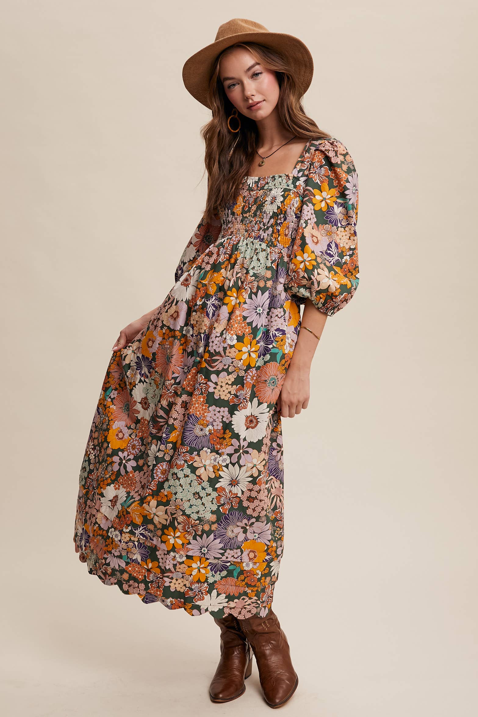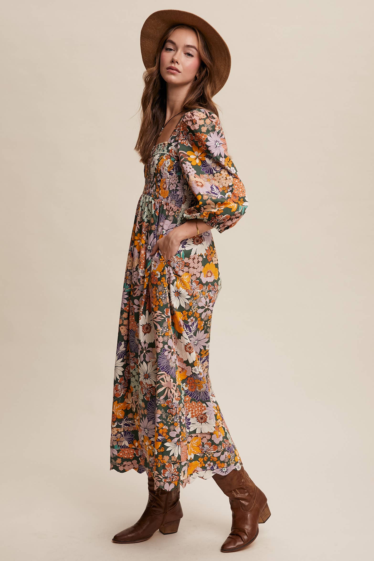 Bold and versatile, this floral maxi dress combines boho ease with statement-making style. Perfect for Western-inspired looks, casual outings, or dressed-up occasions, it pairs effortlessly with boots, sandals, or a wide-brim hat.