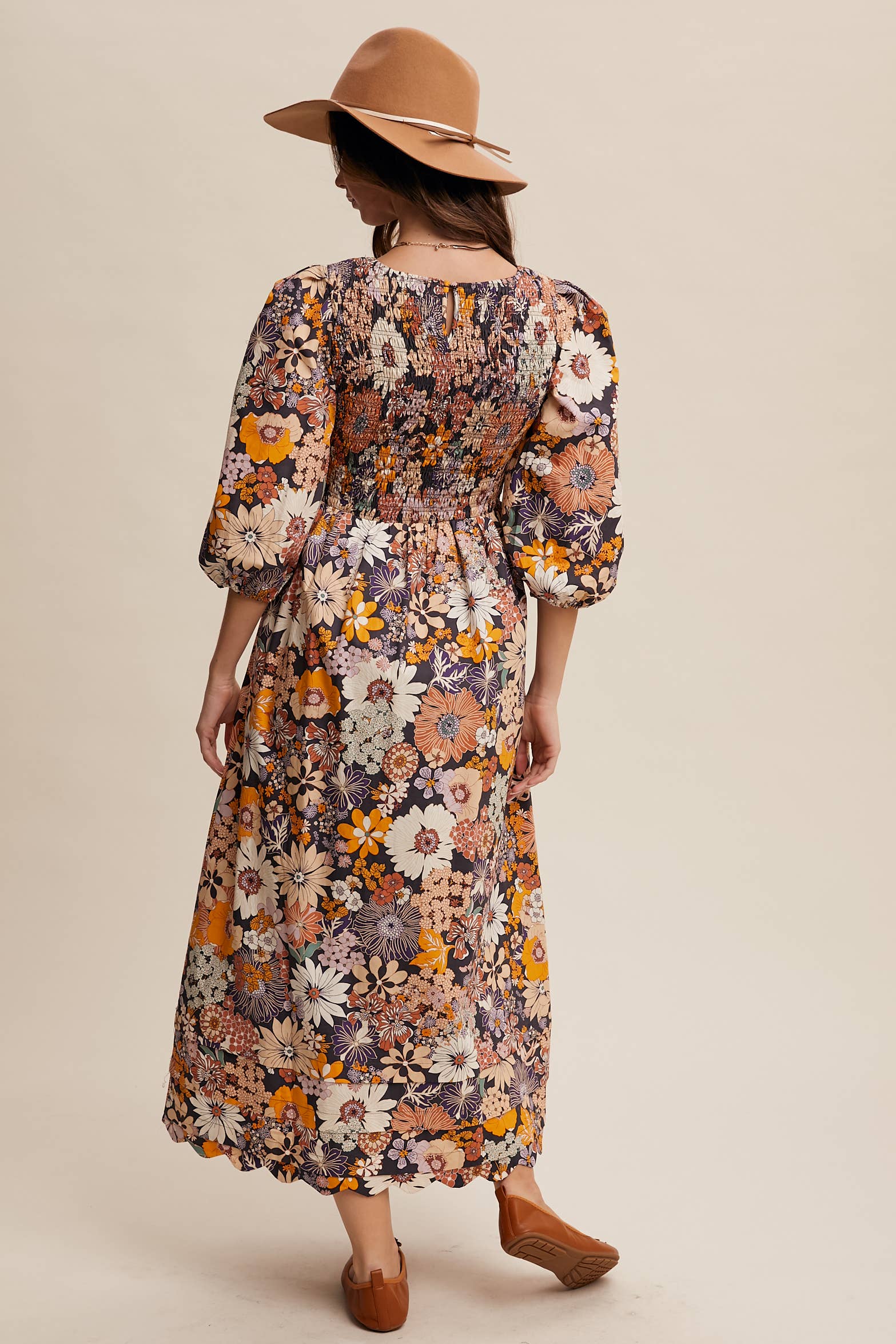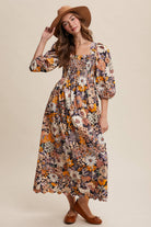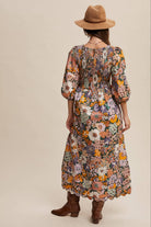 Floral Smocked Puff Sleeve Maxi Dress LD1474: Charcoal / Contemporary / S