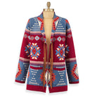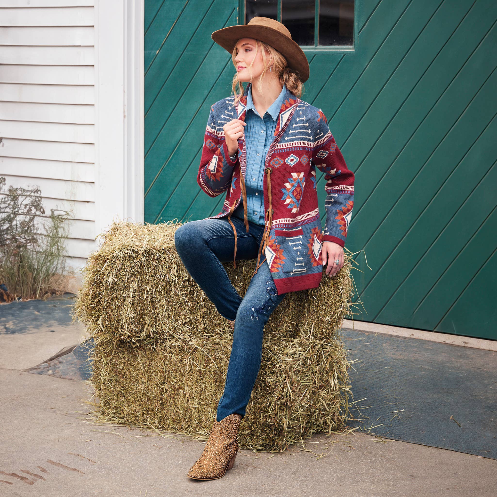 A statement pattern wraps the body and sleeves of this lovely open-front cardigan. Contrast-knit shawl collar, front pockets and antiqued conchos with faux-suede tassels. 28" long in size medium. 100% acrylic. Machine washable. Imported. Sizes: S-XL, 1X-3X.