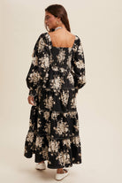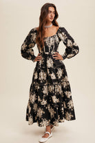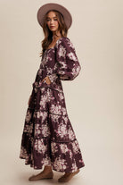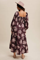 Romantic Floral Tiered Maxi Dress: Red Bean / L