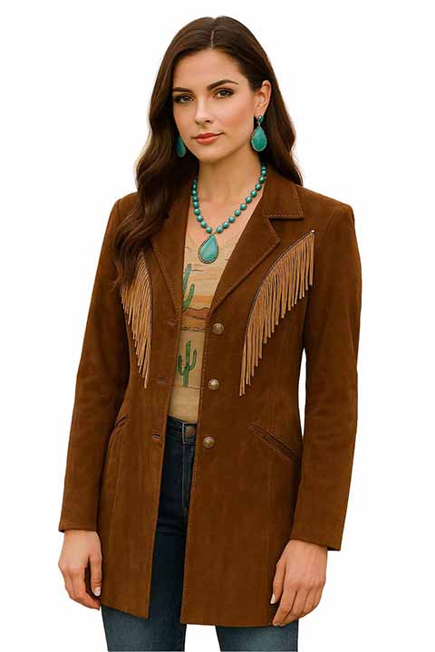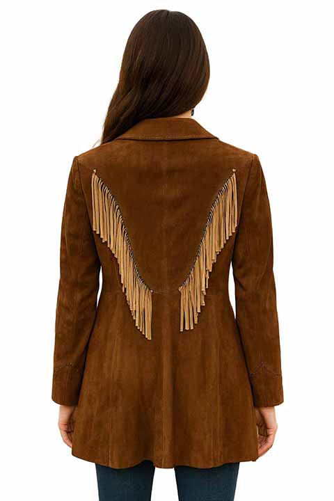 Fringe detail suede coat. Crafted in rich suede, this coat features a flattering tailored silhouette accented with fringe detailing across the front yoke. the two-button. closure and side pockets balance style with function, making it an effort-less piece to layer over everyday outfits or elevate a night-out look.