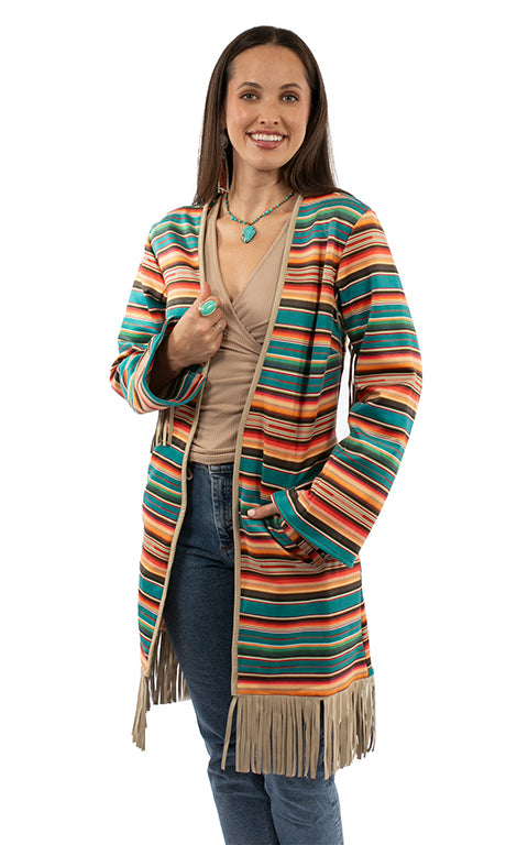Fringed serape duster. Features vibrant serape print, fringed sleeves and bottom hem, split cuffs & fully lined. Microfiber fabric. Import. Dry clean only.