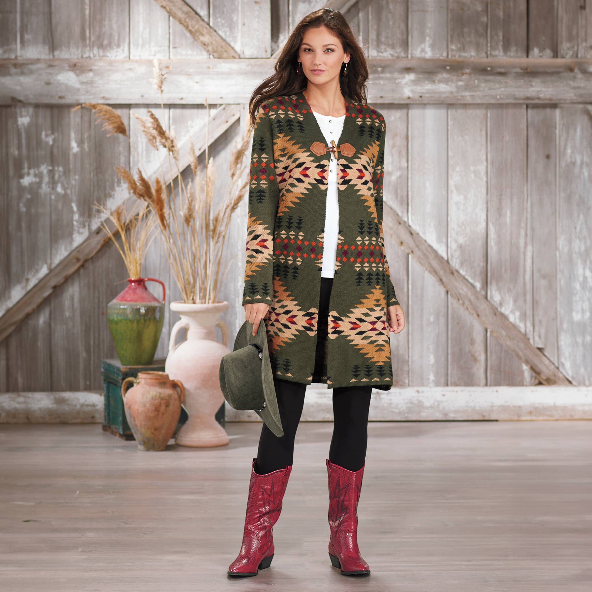 Knit in serene, earth-tone colors, this cardigan features a retro-inspired toggle closure with faux-leather trim. Wears beautifully as a sweater or light jacket. 37" long in size medium. 100% acrylic. Machine washable. Imported. Sizes: S-XL, 1X-3X.