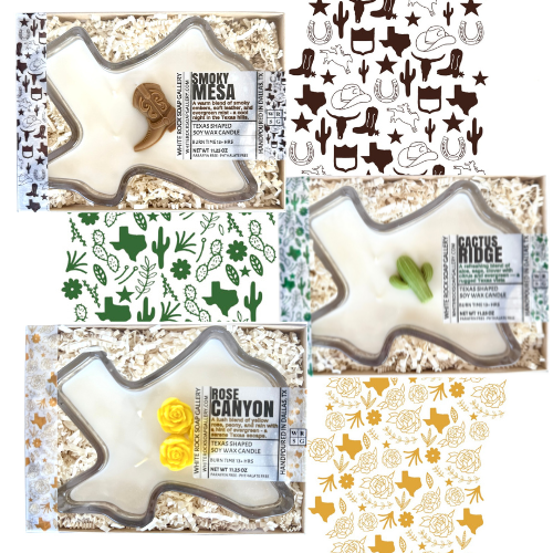 Bring home the heart of Texas with our new Texas Candle Collection. Each candle is made with 100% American soy wax with a touch of Beeswax and Coconut Oil, and Phthalate-Free Fragrance. They each feature a beautifully crafted soy wax embed β a Saguaro Cactus for Cactus Ridge, three Yellow Roses for Rose Canyon, and a Cowboy Boot for Mesa Ridge.