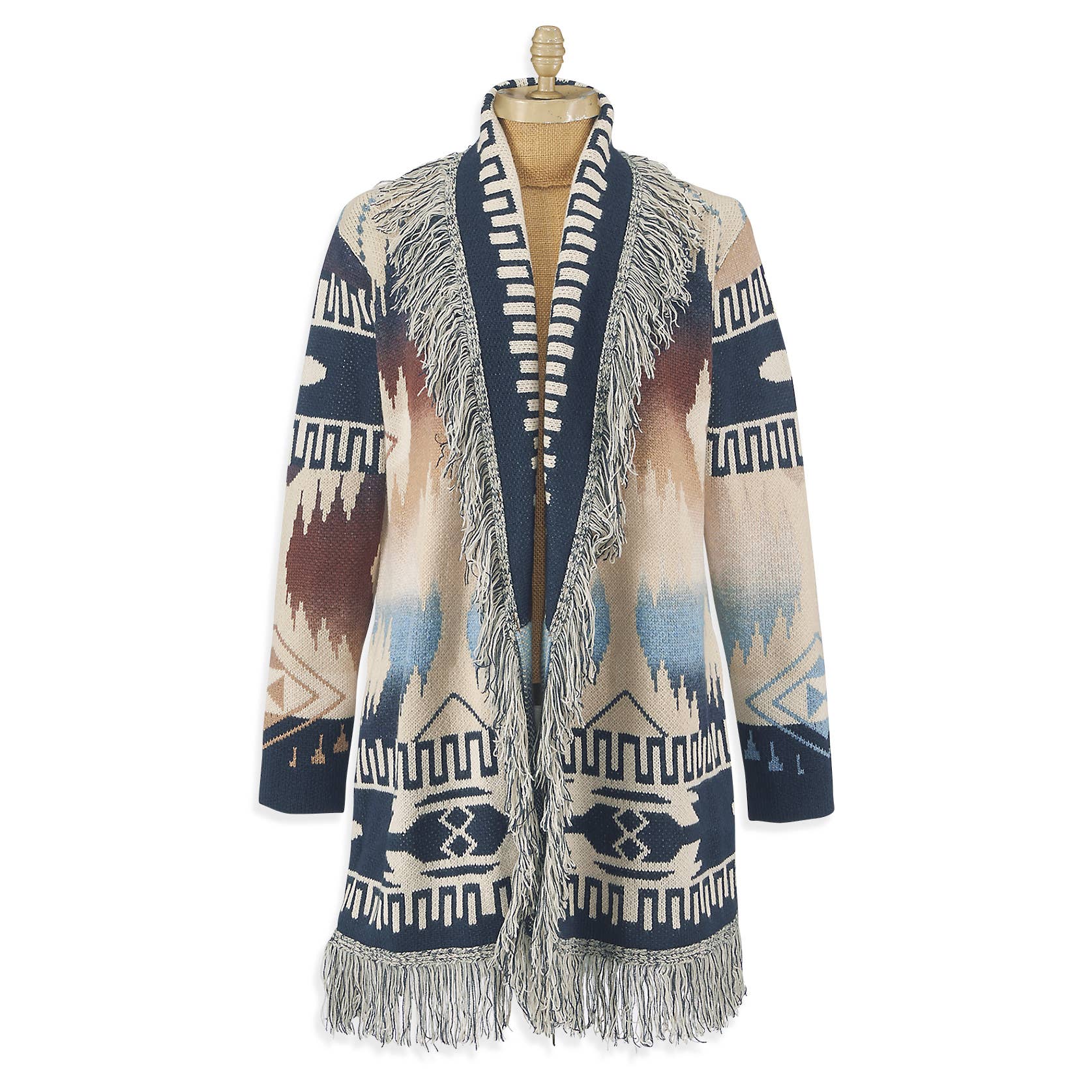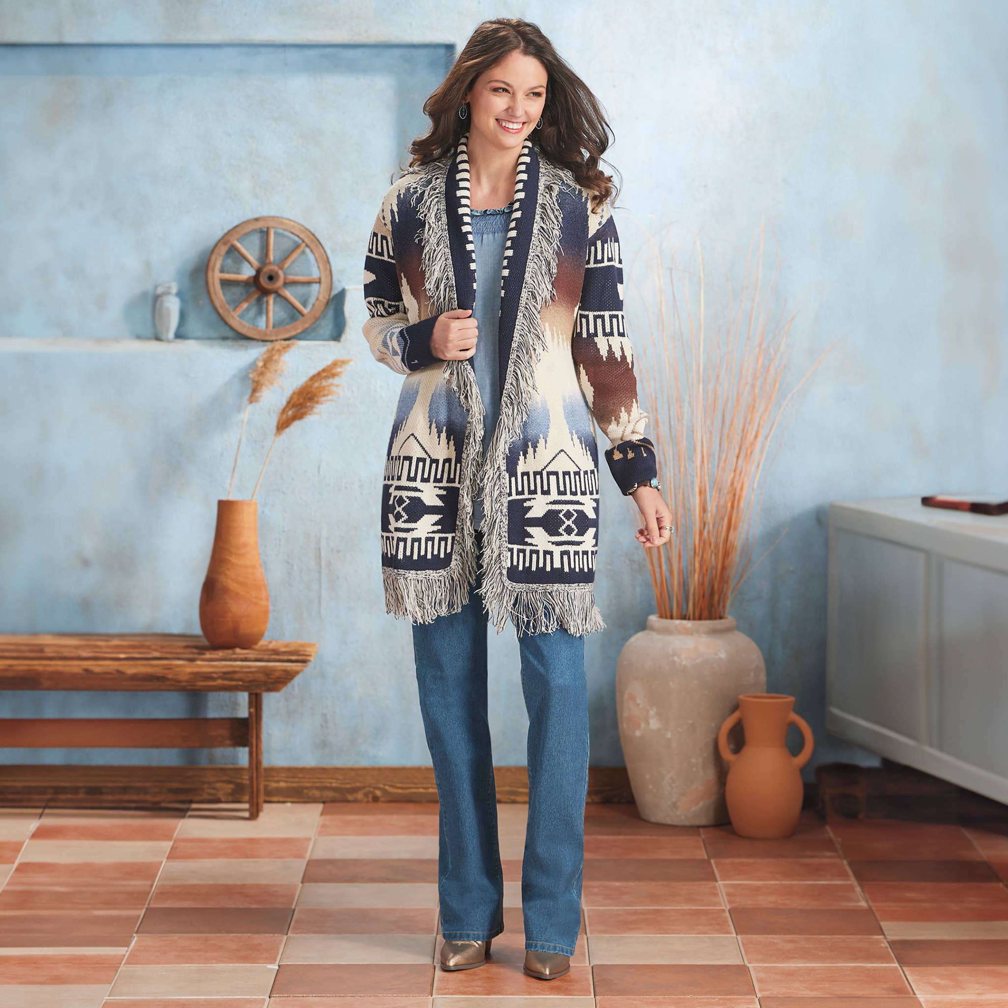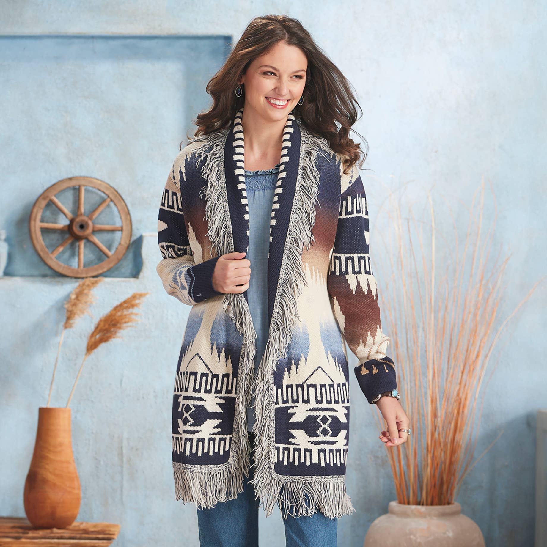 Our beautiful open-front style sweater boasts ombré detail inside an allover geometric pattern. 3" long fringe trims the double-knit shawl collar and hem. Side-seam pockets. 30" long excluding 3" fringe in size small/medium. Acrylic/viscose/poly. Machine washable. Imported. Sizes: S/M (6-12), L/XL (14-18), 1X/2X (18W-24W).